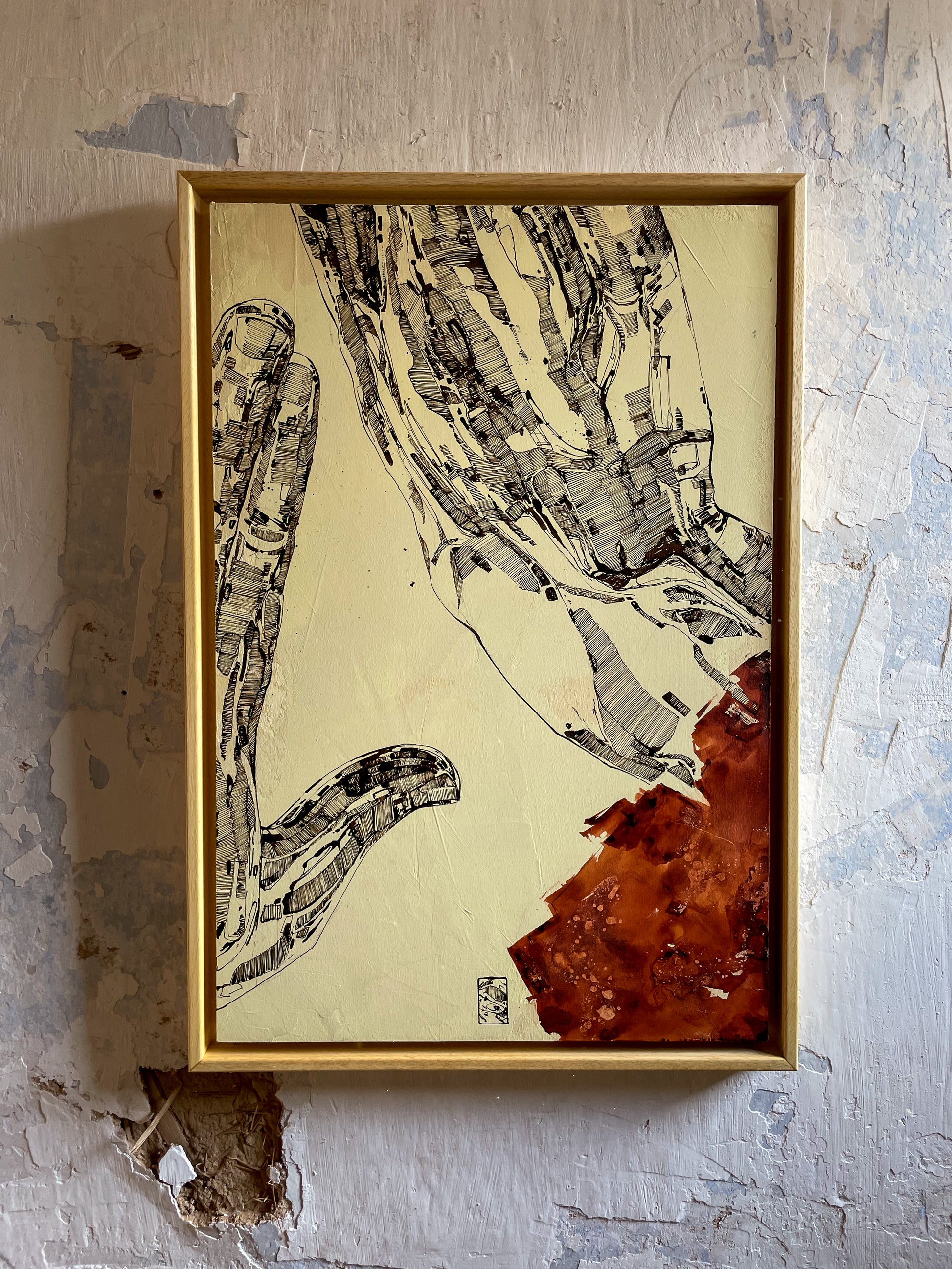 Ink drawing, coloured ink and coloured pencil on wood, 40x60cm, shadow gap