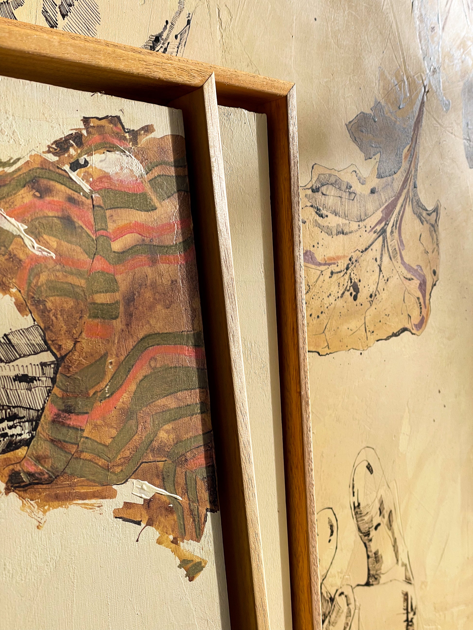 Ink drawing, coloured ink and coloured pencil on wood, 40x60cm, shadow gap